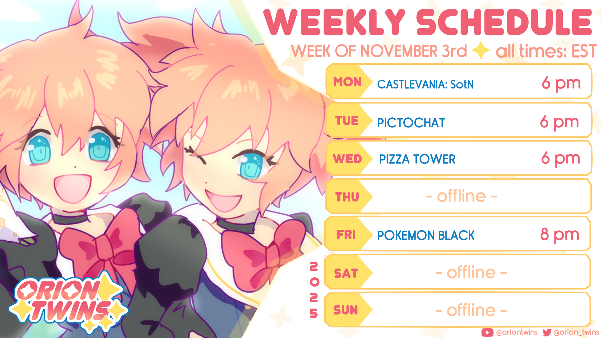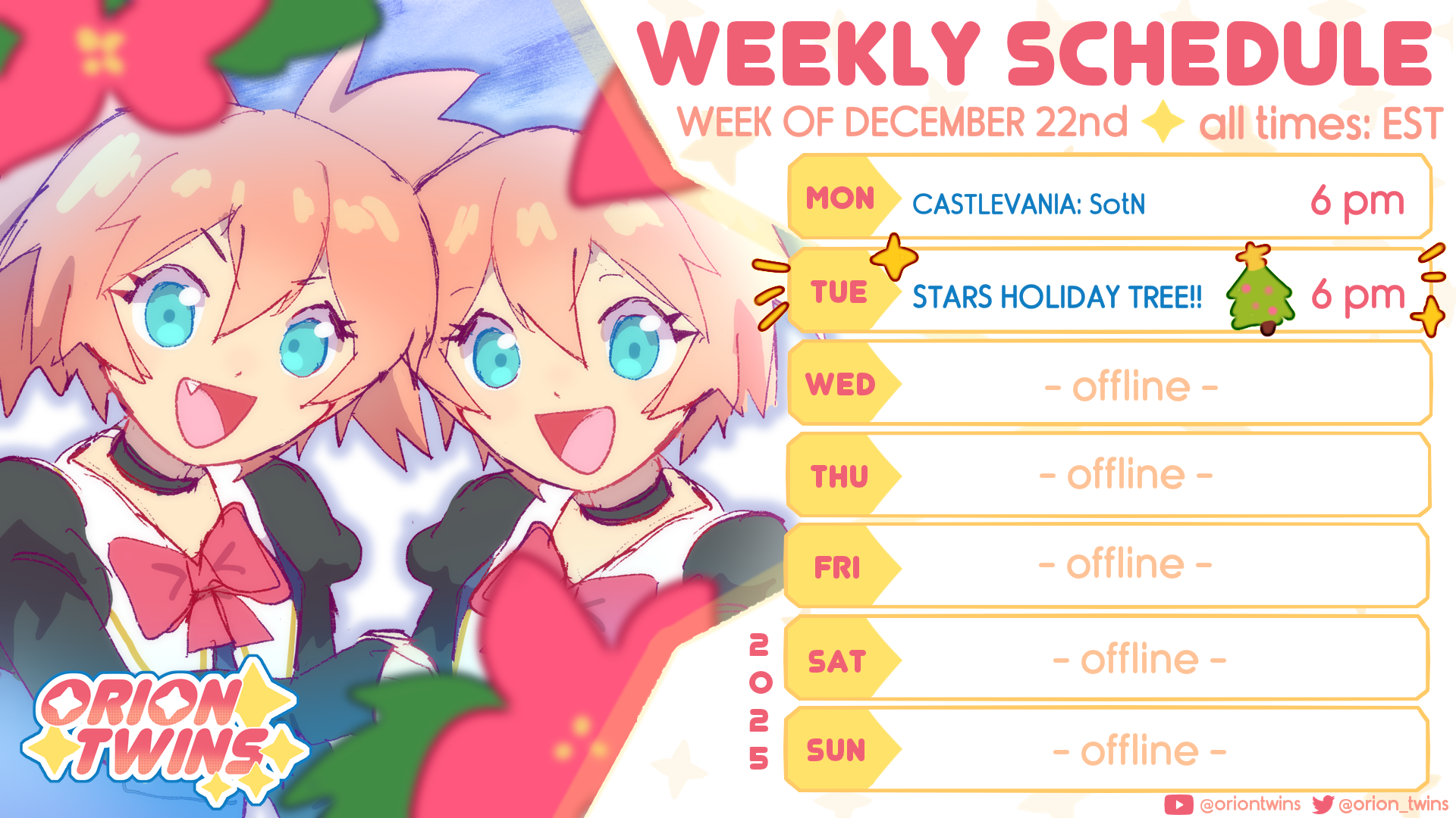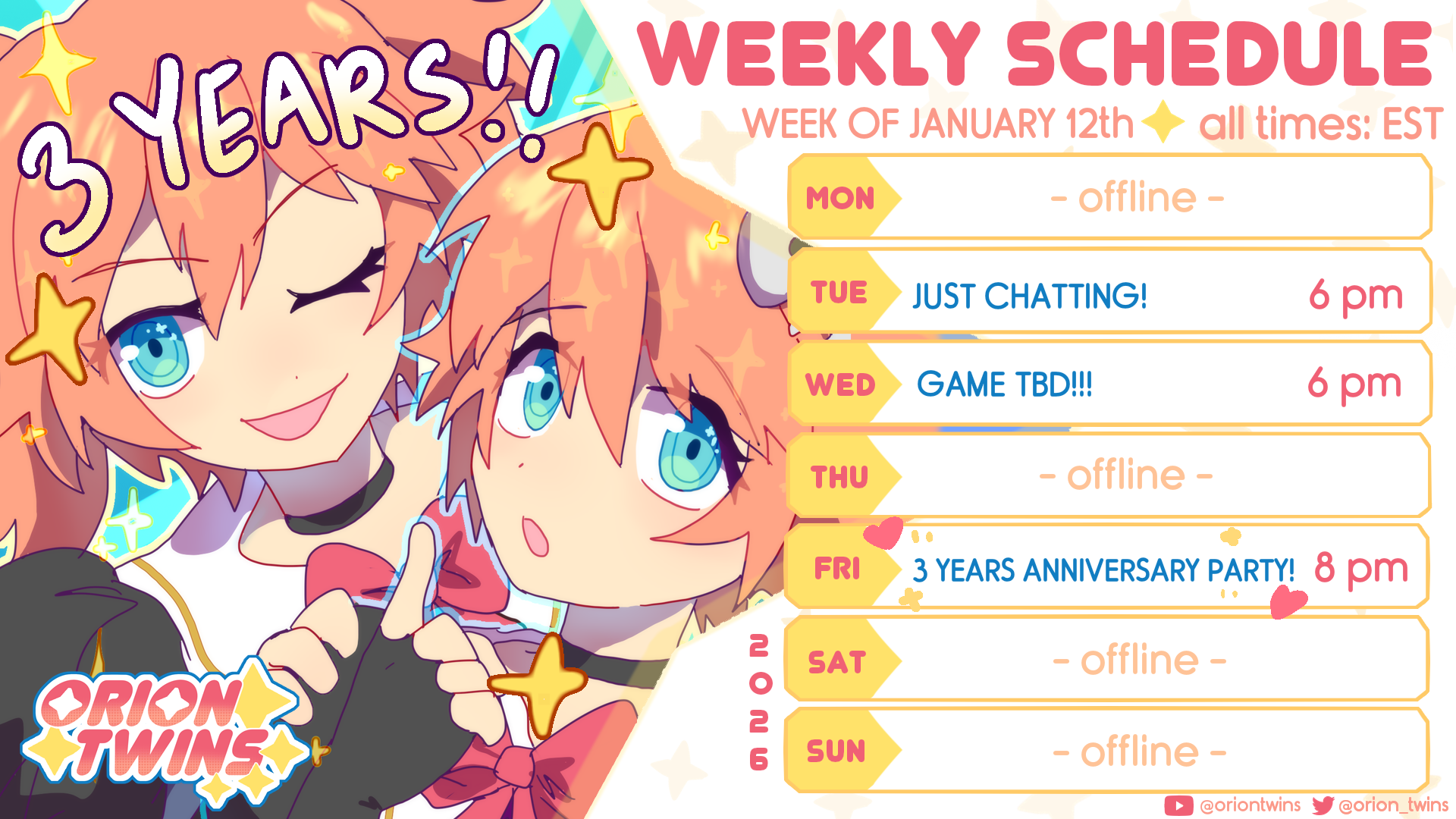 Hi! We're glad you've come to visit our home(planet)page! We are Orion Vega and Orion Eve, twin vtubers who stream on Youtube. But we also like to draw and sing and... do a whole buncha stuff whenever we feel like it!!